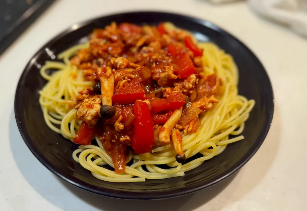 市販のトマトソース缶を使えば、味付けの失敗はありません。パプリカでビタミンもしっかり補給!
